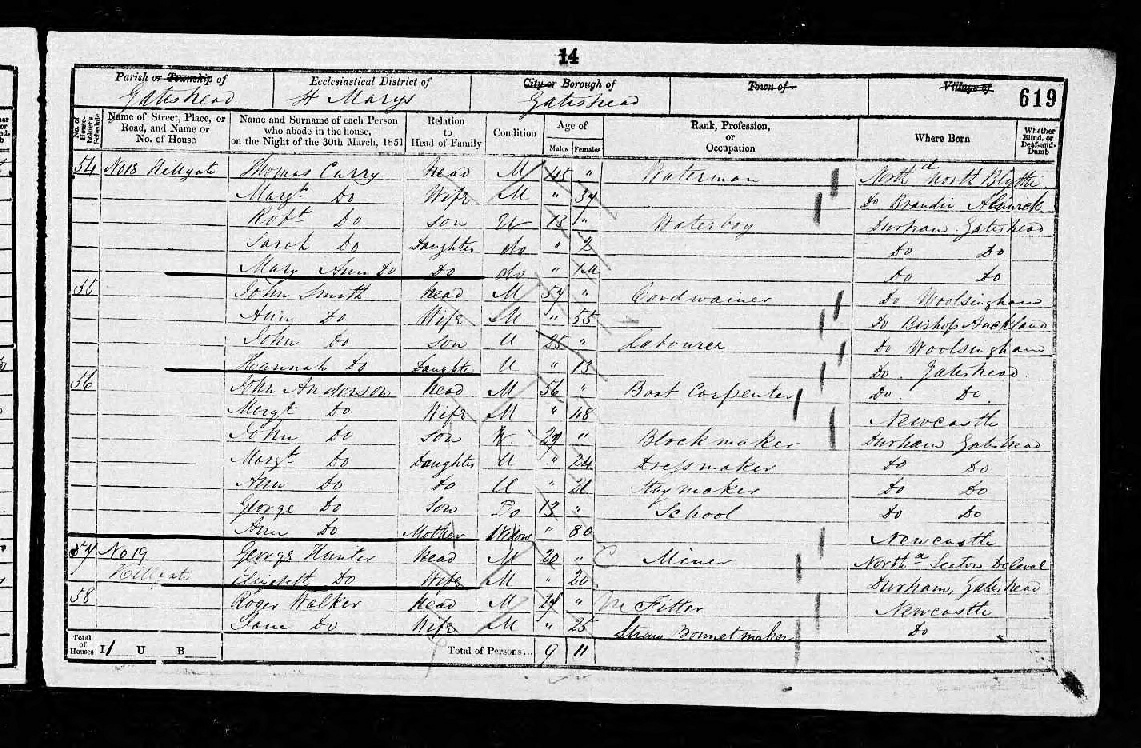 Hard to read the original census but Hannah here is aged 13 living with father John Smith and mother Ann. Hannah father is down again as profession, cordwainer. Address Hillgate, Gateshead as before.