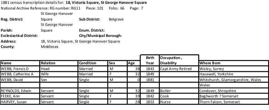 Captain David Webb’s first appearance, not yet a year old, shown as born in Wales, living with his father Francis and mother Catherine in 18, Victoria Square, London, the same district David Webb later marries Dorothy A M Stephens.