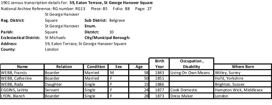 Francis D Webb, Captain David Webb’s father has now moved back to London from Fleet, this time to Eaton Terrace Belgravia.